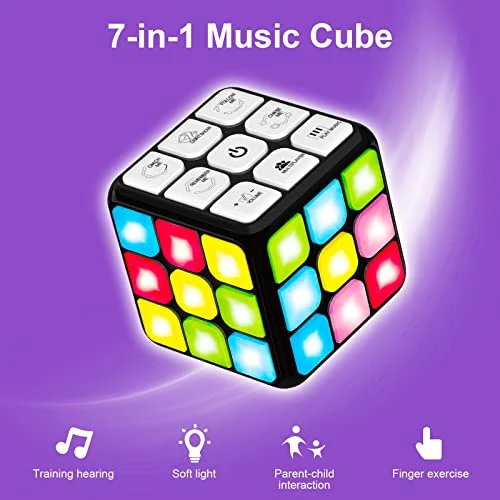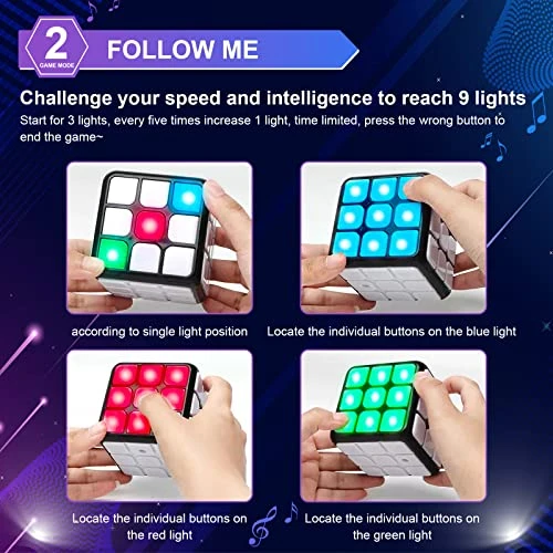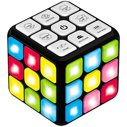 - 🎮 SPEED GAMES – (1- Chase Me) Don’t let the moving light get out of your sight! Race it with your fingers by pressing the buttons while rotating the cube. (2- Catch Me) Quickly press the blinking red lights before time runs out while avoiding green lights and grabbing some “bonus” blue lights!