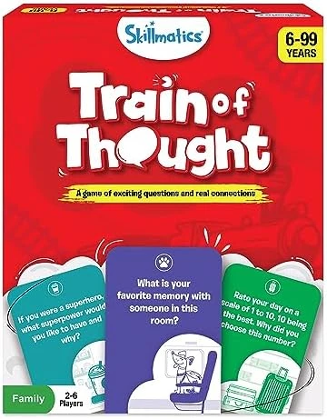 - HOW TO WIN – Each player draws a card from the center and takes turns answering questions. Cards are of 3 colors, each color represents a train compartment. Be the first player to complete your ‘Train of Thought’ by collecting 3 complete compartment sets, 1 set of each of the 3 colors of cards.