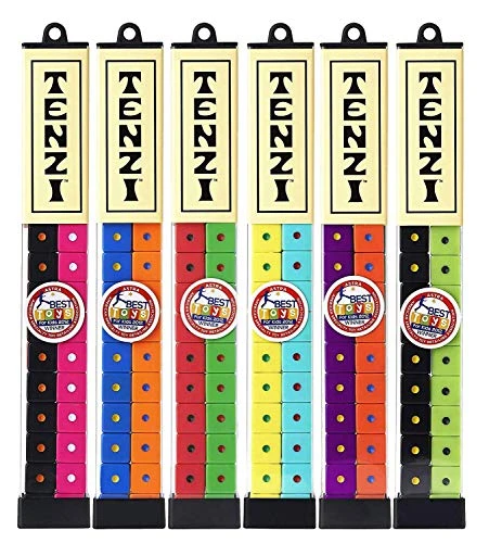 - INCLUDES: 4 sets of 10 colored dice for 2 to 4 players, instructions for 9 different ways to play what has been referred to as the world’s fastest dice game, and a nifty 1.5 x 1.5 x 10 inch dice storage tube to keep your high quality TENZI dice organized. Note – Dice colors may vary.