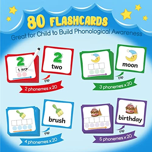 - 【Packaging Includes】You will receive a total of 80 sound box mats (20 cards for each 2, 3, 4, and 5 phonemes), 100 pieces of round red chips, 2 dry-erase markers