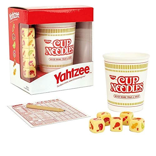 - Includes custom Cup Noodles dice cup, custom scorepads and custom Yahtzee dice featuring unique icons familiar to Cup Noodles fans – chicken, beef, shrimp, lime, corn, and carrots!